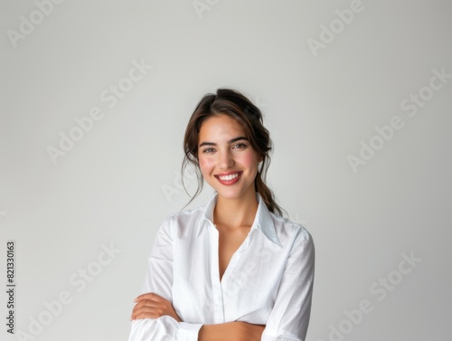 Stylish young brunette woman smiling on a white background. Beauty and fashion. Style.