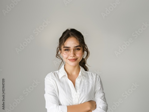 Stylish young brunette woman smiling on a white background. Beauty and fashion. Style.