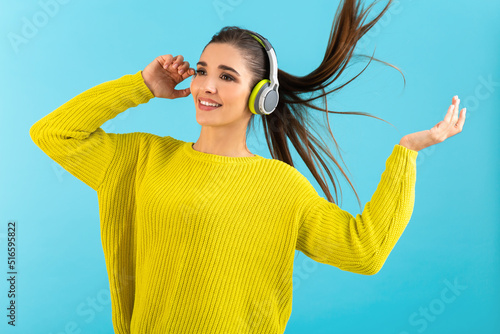 stylish young woman holding listening to music in headphones