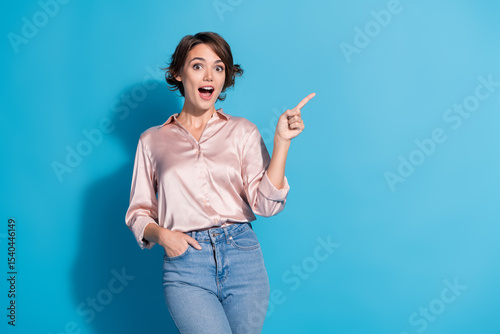 Stylish young woman in satin pink blouse points excitedly against vibrant blue background, showcasing fashionable elegance