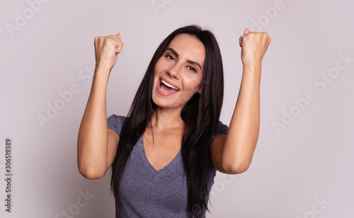 Success! Close-up photo of a good-looking excited woman with long chestnut hair, who is posing with her both hands in fists and her mouth wide open, expressing success.
