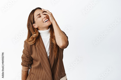 Successful middle aged woman smiling, touching her face and posing carefree against white background, wearing brown suit