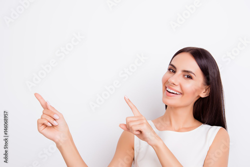 Successful smiling businesslady is pointing up with fingers. She is in isolated on the snow white background