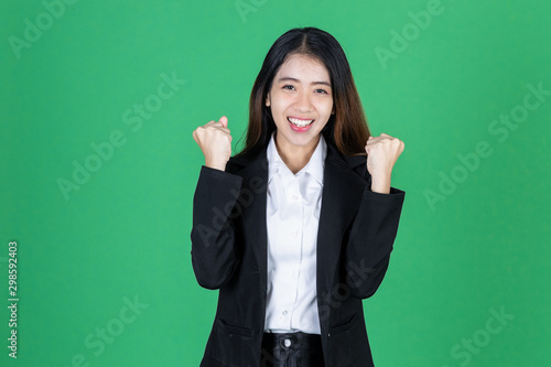 Successful young Asian business woman in suit raising hands and smiling on green isolated background.