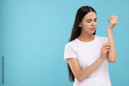 Suffering from allergy. Young woman scratching her arm on light blue background. Space for text