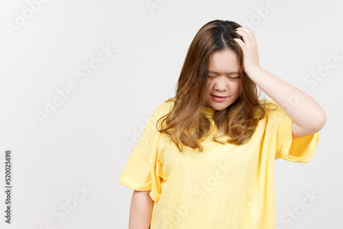Suffering Headache of Beautiful Asian Woman wearing yellow T-Shirt Isolated On White Background