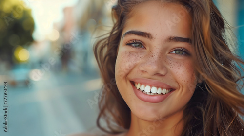 "Sunlit Smile in the City" Radiant young woman with sun-kissed freckles and a beaming white smile enjoys a sunny day in the city, her happiness infectious.