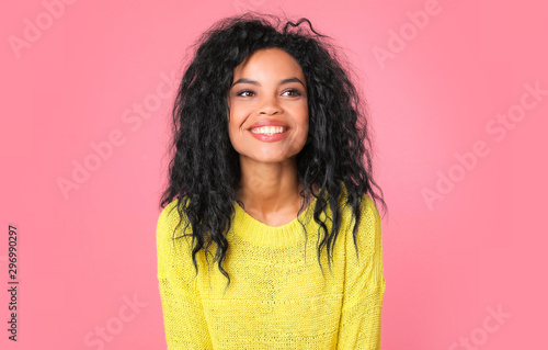 Sunny girl. Beautiful tanned woman with Afro hairstyle is laughing while posing in a knitted light yellow sweater, looking to the right and smiling at the camera.