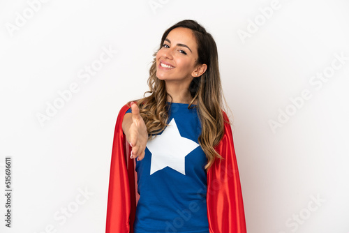 Super Hero woman over isolated white background shaking hands for closing a good deal