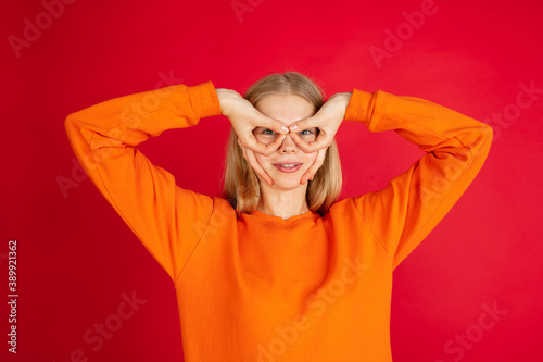Superhero, avatar. Portrait of young caucasian woman isolated on red studio background with copyspace. Beautiful female model. Concept of human emotions, facial expression, sales, ad, youth.