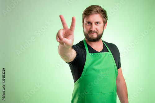 Supermarket employee with green apron showing victory