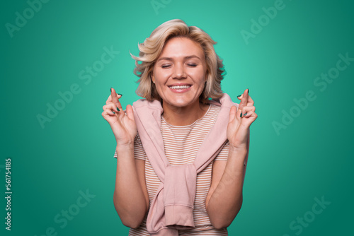 Superstitious girl crossing finger with hope for good luck, closing eyes, believing in something wonderful isolated over green background.