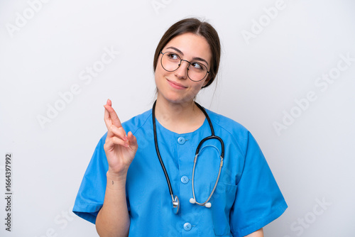 surgeon doctor woman holding tools isolated on white background with fingers crossing and wishing the best
