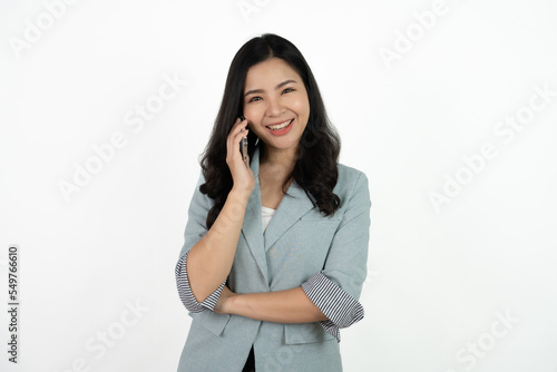Surprise asian beautiful woman using smartphone isolated on white background.