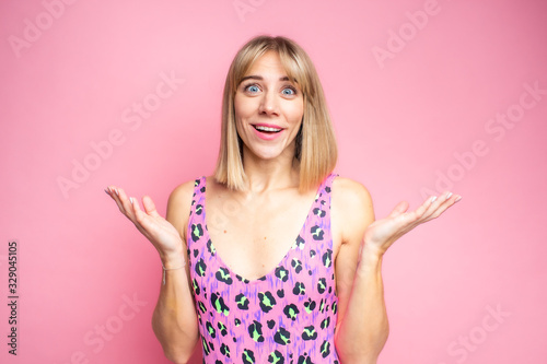 Surprised amazed beautiful blonde woman in pink leopard swimsuit with wide open mouth looking at camera, smiling on a pink background.
