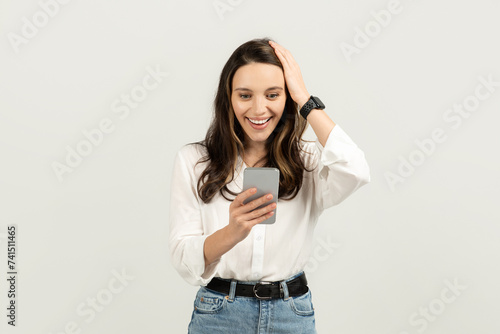 Surprised and delighted woman looking at her smartphone with one hand on her head