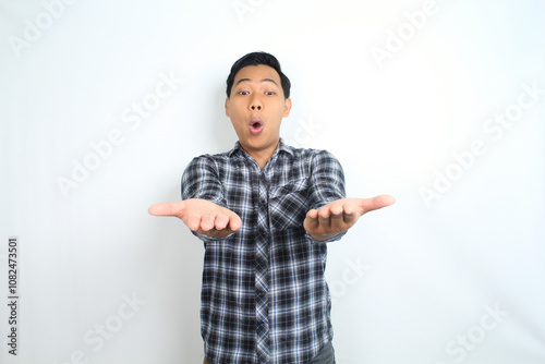 surprised asian man presenting hand to copy space with funny face shocked expression isolated on white