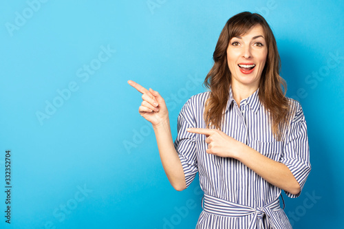 surprised beautiful girl in a dress shows her fingers to the side, looking directly at the camera. Concept summer, recreation, travel