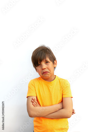 Surprised boy crossed his arms and raised his shoulders on white background. Vertical photo