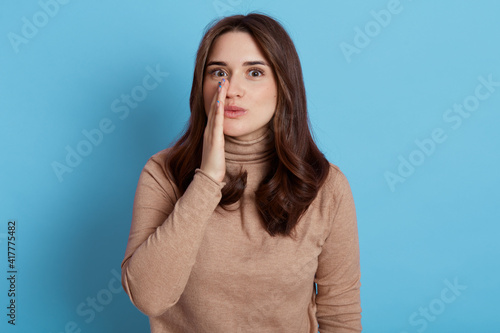 Surprised curious dark haired European woman keeps hand near mouth and whispers secret, looks with wondered expression at camera, wearing casual beige turtleneck, isolated on blue background.
