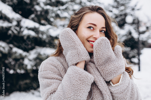 Surprised girl covers her mouth with hands wearing mittens and laughs