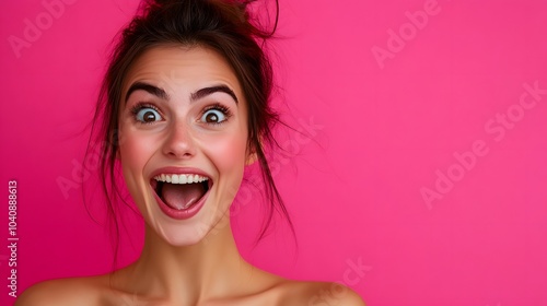 Surprised happy beautiful woman looking in excitement. Studio shot on pink background.