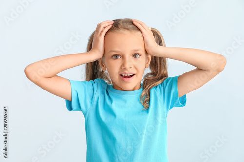 Surprised little girl on light background