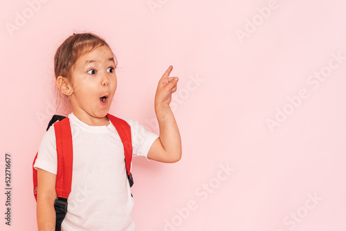 Surprised little girl with a red briefcase points her finger against a pink background.