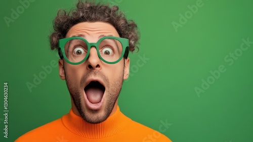 Surprised man with curly hair wearing green glasses and orange sweater in front of a bright green background expressing shock and excitement