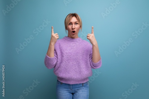 surprised shocked cute blond young woman in purple sweater showing hand up on blue background with copy space