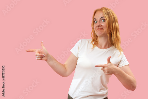 Surprised smiling woman points her fingers to the side and looks in camera. Portrait of round-faced woman with ginger hair. Pink background
