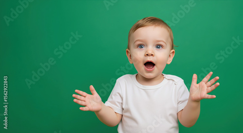Surprised toddler with blue eyes and raised hands showing open palms against green background. Pure infant amazement and playful gestures. Baby products and childcare campaigns