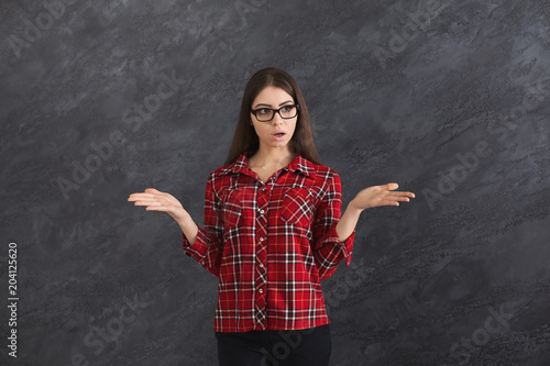 Surprised woman showing something, holding hands