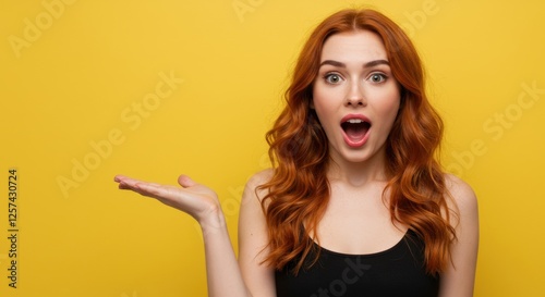 Surprised woman with red hair on vibrant yellow background expressing excitement and curiosity