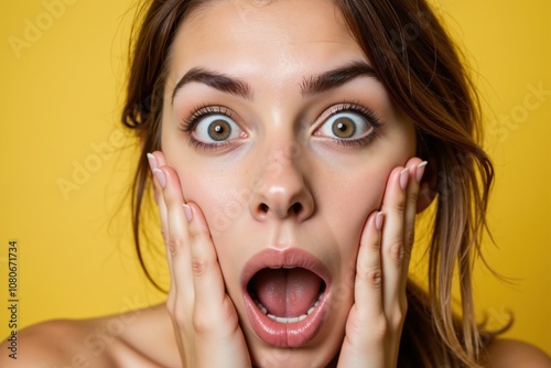 Surprised woman with wide eyes and open mouth against yellow background expressing shock.