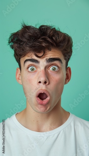 Surprised Young Man on Pastel Green Background for Realization Concept