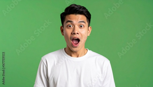 Surprised Young Man with Open Mouth on Green Background, Expressing Shock