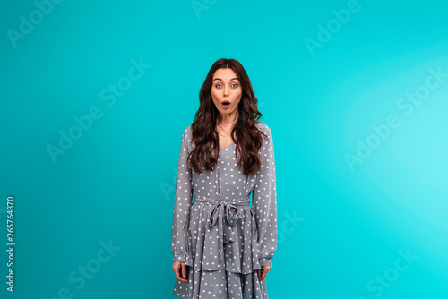 Surprised young woman in a dress isolated over turquoise blue background