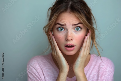Surprised young woman touching her face with wide eyes and slightly open mouth expressing shock or disbelief