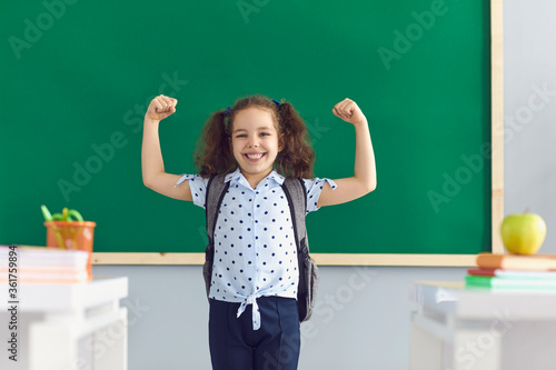 Sweet girl showing her muscles in classroom. Strong kid expressing motivation to achieve success. Back to school
