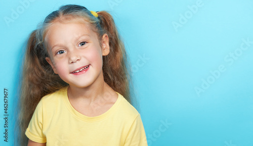 Sweet little girl child has lost the first lower milk teeth. Childhood oral hygiene, toothless smile.