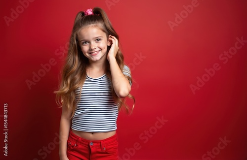 Sweet shiny girl in striped top, red pants on red background. Happy smiling child shows healthy soft hair. Casual style, beauty, care, haircare advertisement. Copy space for beauty products.