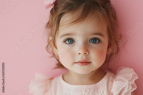 Sweet toddler girl dressed as a princess with delicate features and a soft pink background conveys innocence and joy in a charming moment