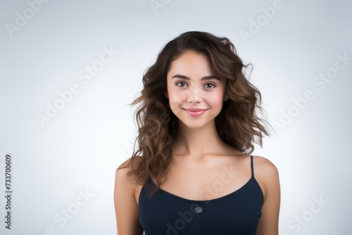 Sweet young girl dressed in comfortable vest undergarments, exuding confidence as she poses gracefully on a pristine white surface. Generative AI.