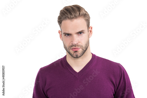 Take control of your face. Unshaven man isolated on white. Mens skin care. Male skin cosmetics