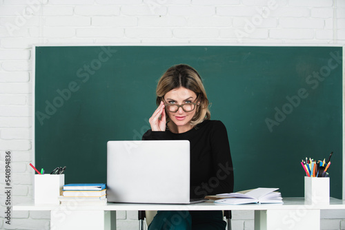 Teacher in classroom at university or college. Female student on board with computer laptop. Lesson seminar skills. Female teacher trainer tutoring.