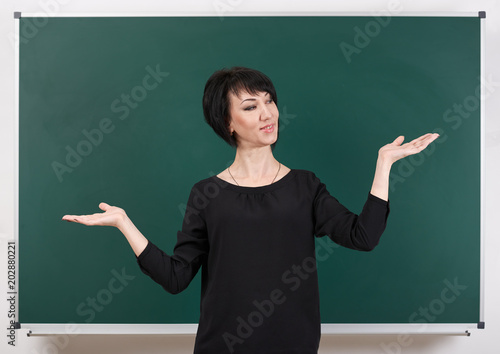 teacher show anything on chalk board, learning concept, green background, Studio shot