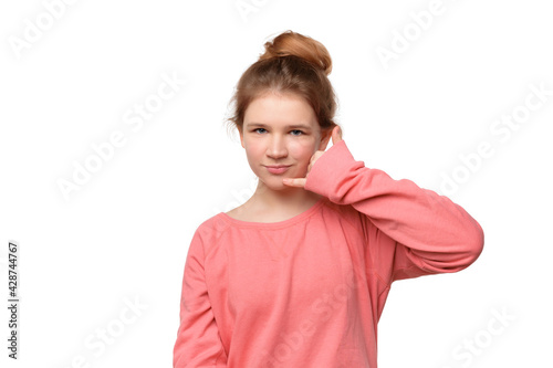 teen girl imitates telephone conversation, keeps hand near ear as if holding mobile phone, saying call me