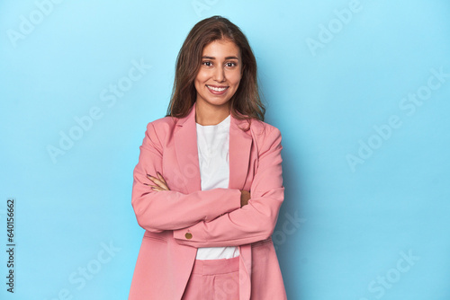 Teen girl in chic pink suit on a blue background who feels confident, crossing arms with determination.