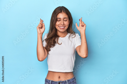 Teen girl in white T-shirt on a blue background crossing fingers for having luck